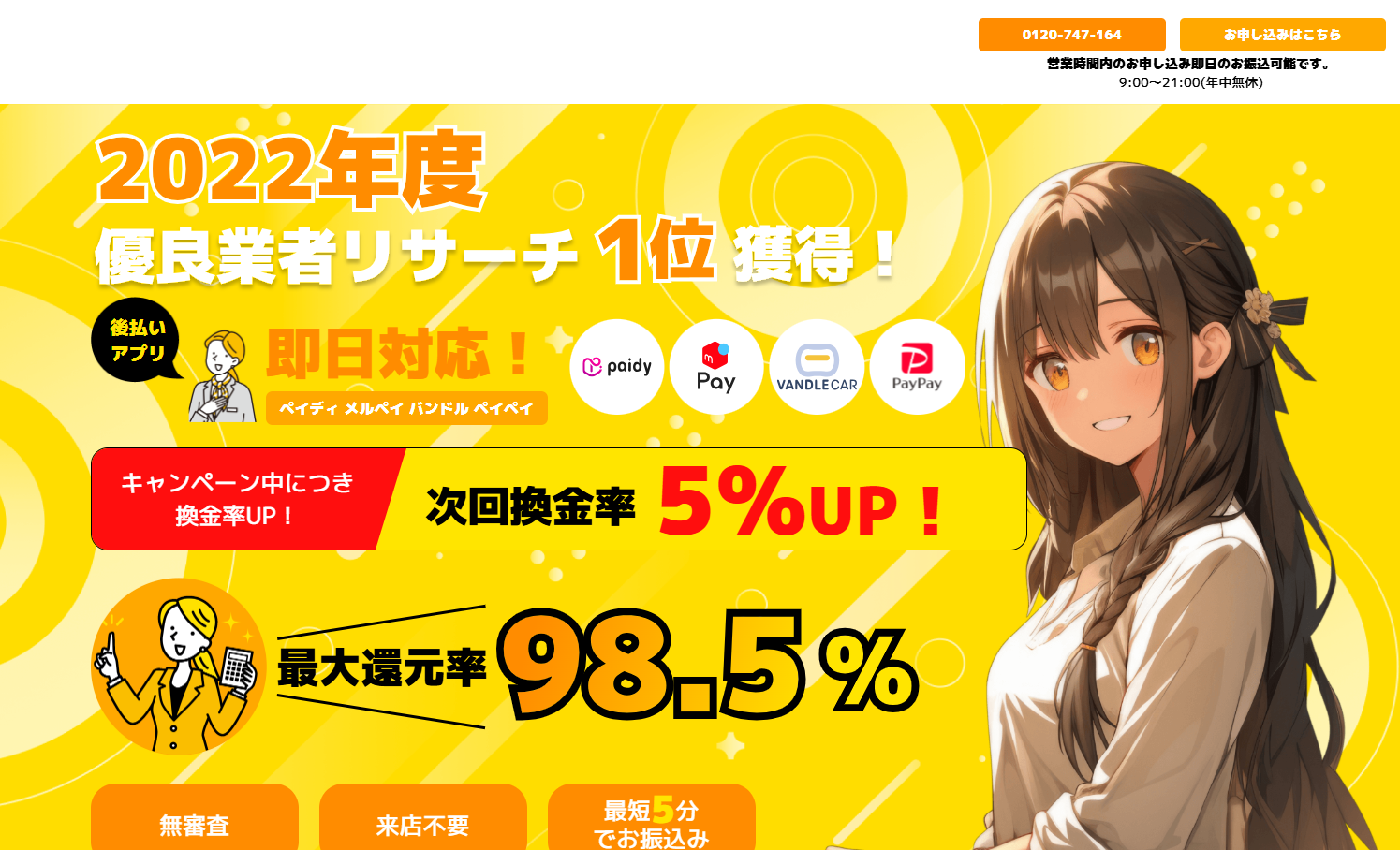 クイックマネープラスは公式サイトの「最大換金率98.5%」という好条件が目を引く現金化業者。